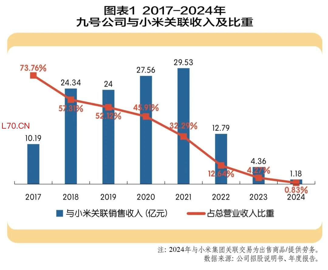 经过创始人多年的不懈努力,九号公司成为了一家拥有强大自主品牌和全球化视野的科技平台型企业。而小米从最初的战略股东、合作伙伴关系,逐渐转变为财务投资关系,并借助公司成功上市完成了退出,最新持股比例已低于5%。近些年,公司与小米的关联交易规模持续下降,2024年仅为1.18亿元,权重也已经不足一个百分点,实现了从“小米生态链供应商”到“独立品牌”的战略转型。