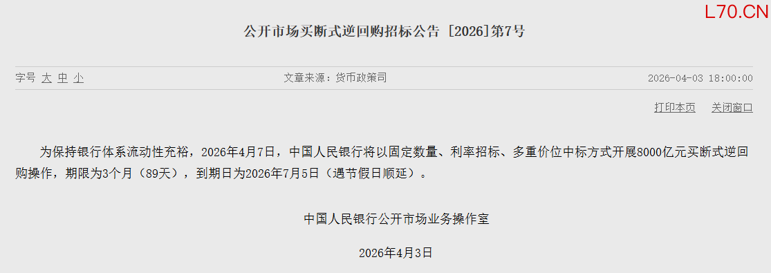 央行:4月7日将开展8000亿元买断式逆回购操作 期限为3个月央行:4月7日将开展8000亿元买断式逆回购操作 期限为3个月