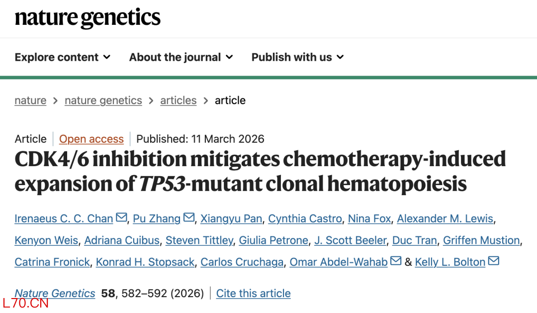 3月11日,《Nature Genetics》的研究报道“CDK4/6 inhibition mitigates chemotherapy-induced expansion of TP53-mutant clonal hematopoiesis”,提出了一种巧妙的药理学干预策略。研究人员发现,在化疗期间同步使用CDK4/6抑制剂,能够有效阻断化疗诱导的TP53突变克隆的扩张。这不仅为预防化疗相关的继发性血液肿瘤提供了首个概念验证(proof-of-concept),更向我们揭示了如何通过干预细胞周期来重塑体内微观进化的轨迹。