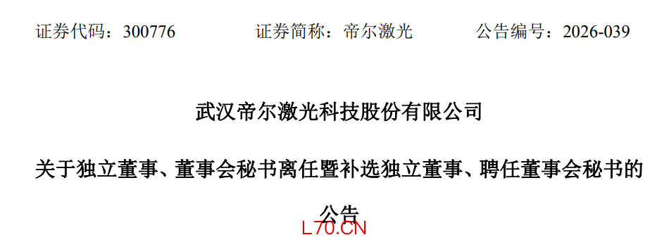 最新消息,帝尔激光发布公告宣称,公司董事会于2026年3月10日收到独立董事吴裕斌先生提交的书面辞职报告,吴裕斌先生因个人原因申请辞去公司第四届董事会独立董事、董事会提名委员会委员及薪酬与考核委员会委员的职务,辞职后不再担任公司任何职务。吴裕斌先生原定任期至第四届董事会任期届满之日止。